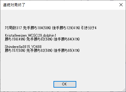 あと、shinderella_cuteはorqhaから学習したのにorqha同士を振り飛車の初期局面から戦わせた場合よりも勝率が高くなっています(orqhaミラーでの後手振り飛車勝率は3割未満)。